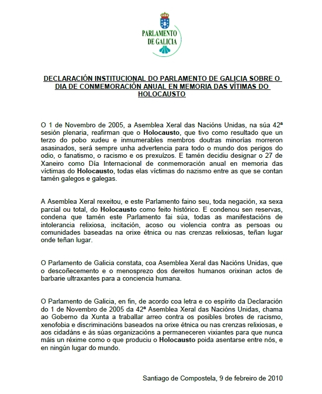 Os tres grupos con representación na Cámara -PPdeG, PSdeG e BNG- acordaron unha declaración conxunta onde recordan que o 1 de novembro de 2005, a Asemblea Xeral de Nacións Unidas reafirmou que o Holocausto tivo como resultado que "un terzo do pobo xudeu e innumerábeis membros doutras minorías morreron asasinados", o que será "sempre unha advertencia para todo o mundo dos perigos do odio".